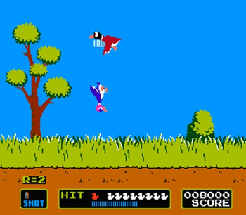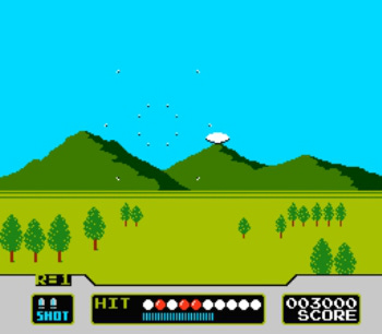 Regardless of which game mode you choose, each round allows you to try your aim at either 10 ducks or clay pigeons per round. The hit indicator at the bottom of the screen serves as a quick visual reference showing the number of targets shot in the current round. The blue bars below the duck-shaped icons (disc-shaped in the clay shooting game) represent the “pass line”—an indicator that shows the player how many hits are required to pass to the next round. Every few rounds, the quota minimum increases, demanding fewer misses or else it’s game over, man.