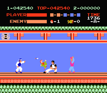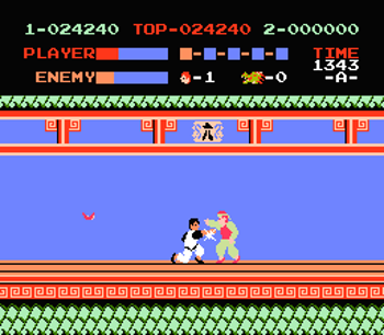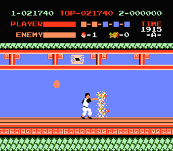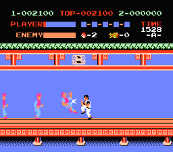 The audio quality was a good attempt at emulating the arcade version. What stands out to me the most is the digitized voices. Each time you kick or punch, Thomas makes a realistic quip. The same occurs when bosses sustain damage as well. They also give a taunting laugh if they defeat you. Besides the brief tunes that play at transition segments (beginning a new game, moving to the next level, etc.), there is only one main melody throughout the game. But it’s a good one.