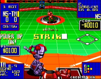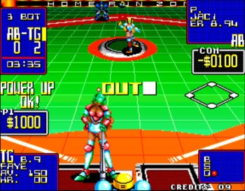As your money increases, you can purchase armor upgrades that augment fielding, batting, and pitching abilities. Each upgrade category is divided into three tiers, A through C, with increased effectiveness (and cost) the higher the alphabetical letter. The upgrades wear down over time, as evidenced by electrical sparks and later spewing flames from the player’s armor. This introduces an added layer of strategic planning when deciding when to upgrade and how many within a given inning, especially early in the game.