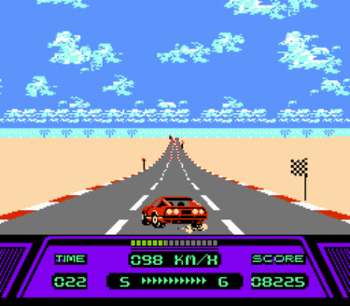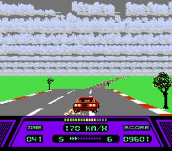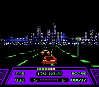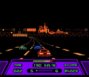 The music for Rad Racer was composed by Nobuo Uematsu of Final Fantasy fame. There are only three music tracks, but they fit the game very well. Best of all, you can change songs at any time during the race by pressing the down arrow on the controller, just as you would change the station on a car radio.