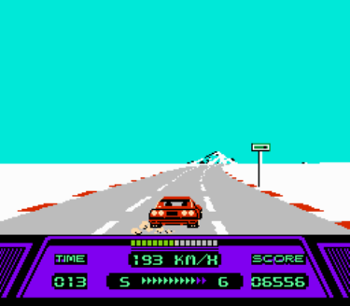 Assuming that you've chosen the Twin Turbo, you'll be competing against cars like the Volkswagen Bug, Lamborghini, Corvette, Testarossa, and a few other real-world vehicles. As you progress through the courses, the cars drive more aggressively and try to get in your way. You’ll want to use caution when you engage the turbo boost while speeding down a traffic-littered straightaway.