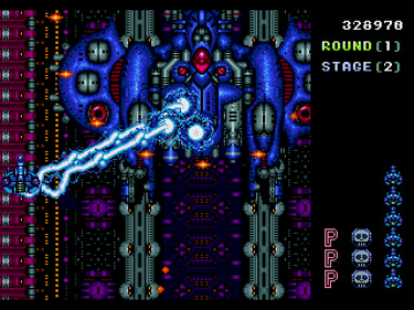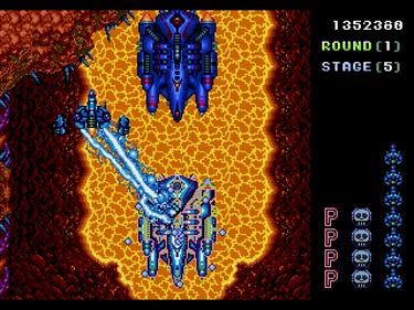 The effectiveness of each weapon can be improved by collecting “P” capsules. Collecting five capsules upgrades your shot to the next power level; an additional five more give your ship maximum firepower. Doing so is worth the effort because each weapon is quite useful depending on the situation at hand. Best of all, the upgrades apply across all three weapons, leaving you free to experiment and see which of them you like best without the worry of needing to upgrade each one individually.