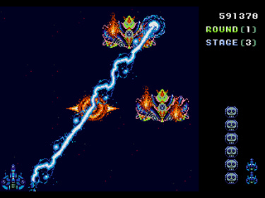 But the fully upgraded Thunder Laser, ladies and gentlemen, is the real star of the show. It fires five electrical bolts that cover a 90-degree radius, making it very easy to defend against incoming enemy fleets that often try to bombard you from multiple areas of the screen, especially in the later stages. You’ll barely need to move around, except when certain enemies attack directly from the rear of your ship.