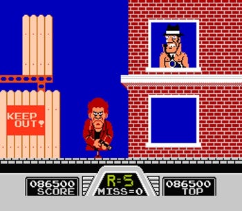 In the same vein as other early NES light gun games, Hogan’s Alley is made of three parts-- Game A, B, and C. Game A is a simple shooting range where each round consists of a mixed lineup of 3 characters. Your goal is to quickly identify and shoot the gangsters in the lineup. Naturally, there will be civilians in the lineup as well, so care must be taken not to shoot them. The numeric figure above the characters represents how many seconds you have to hit to correct targets. This is where much of the challenge is presented.