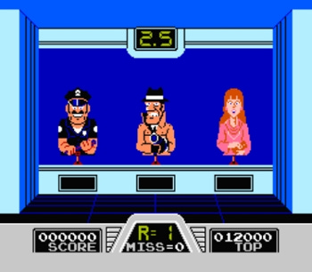I never thought that a game could force me to call into question my ability to identify and shoot a few targets. Hogan’s Alley forces you to hone both your marksmanship and quick judgment skills. You are placed in a training facility that houses cardboard cutouts of six individuals. Three of the six are the targets you want to shoot—Gangster A, Gangster B, and, you guessed it, Gangster C. The other three characters are the innocent civilians that you’d best not shoot—the Lady, the Professor, and the Policeman. Shooting a civilian or failing to shoot the gangster(s) onscreen counts as a “miss” against you. Get 10 misses, and it’s game over for you.