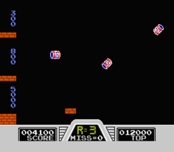 The final game mode, Trick Shot, is mostly just a bonus game mode. In this mode, cans are tossed onscreen, and you have to get them to land on one of the platforms on the opposite side by shooting them to keep them in the air long enough. You are awarded points according to which platform the cans land on—the highest platform awarding the fewest points, and the bottom platform yielding the most points, since it takes a skilled shot to land them there safely without missing. As with the other two game modes, you are allowed up to 10 misses before the game is over. While it doesn’t amount to much in the form of excitement, it’s still a nice diversion, should your brain tire of the shoot/don’t shoot exercises from the other two modes.
